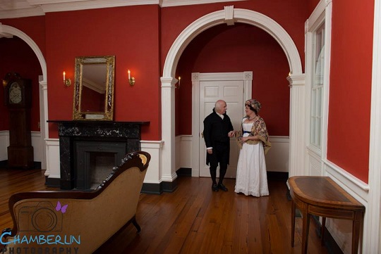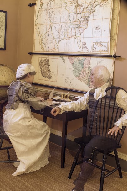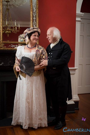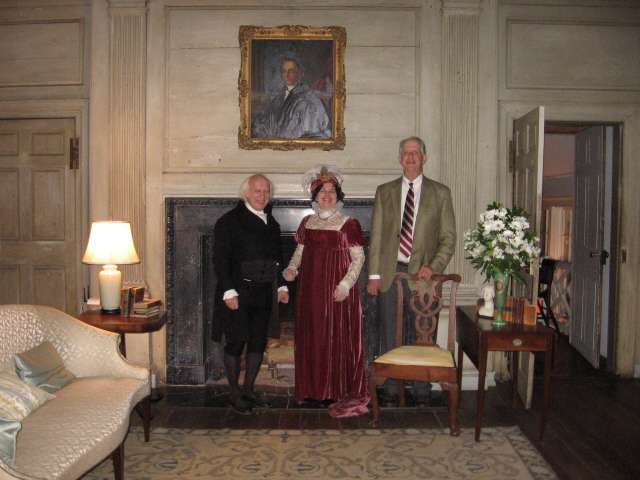 | James and Dolley Madison on the spot where they were wed. The tall gentleman to their left is Walter Washington, a direct descendent of George Steptoe Washington and Lucy Payne Washington. The black marble mantlepiece is said to have been a gift from General LaFayette to George Washington, and the chair came from Mt. Vernon. |