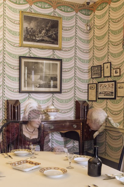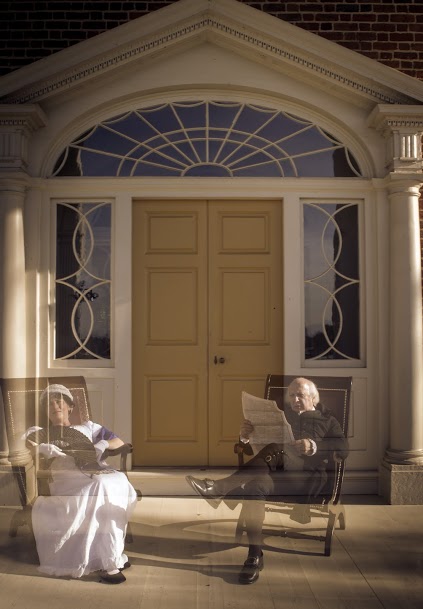 On this day, a photographer from National Geographic took some intimate shots of "James and Dolley Madison" at home in Montpelier. He used an innovative photographic technique that "ghosts" the images of the people, making them look spectral and insubtantial, while maintaining a solid background of all the lovely objects at Montpelier. (A couple of the carriage photes were taken without the ghosting technique, and they are included for their loveliness). All of tese images are by Kenton Rowe Photography, courtesy of the Montpelier Foundation.